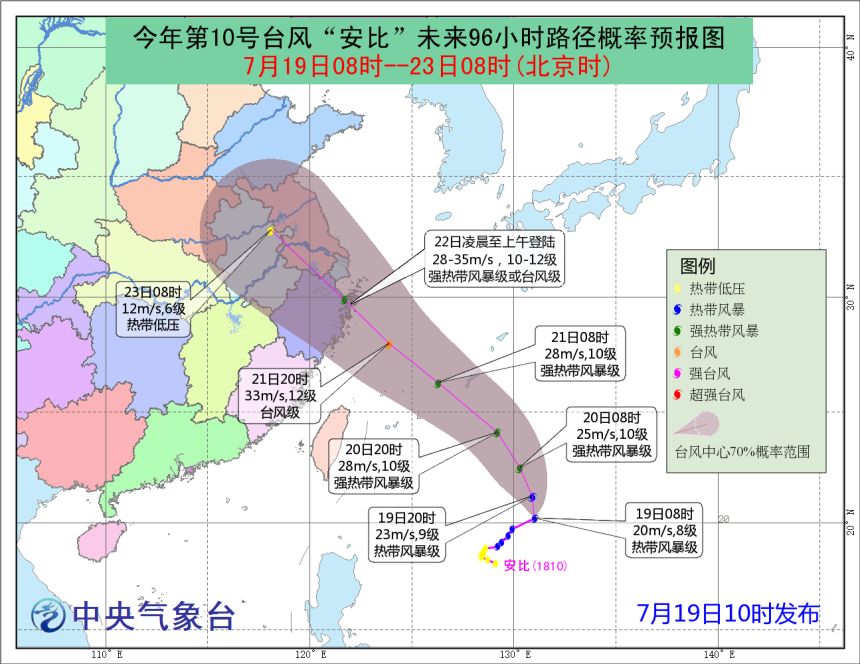 今年第10号台风“安比”(热带风暴级)的中心19日天上午8点钟位于浙江省象山县东南方向大约1370公里,就是北纬20.2度、东经131.0度,中心附近最大风力有8级(20米/秒),中心最低气压为995百帕,七级风圈半径100-250公里。