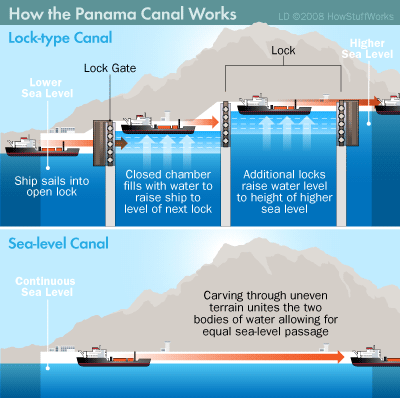 在太平洋一侧有两座船闸,在大西洋一侧有一座船闸。在大西洋一侧的船闸有三层,高达21米,每扇有745吨重,但平衡相当好,只要30千瓦功率的电机即可驱动开合。巴拿马运河全长81.3千米,水深13米~15米不等,河宽152米至304米。整个运河的水位高出两大洋26米,设有6座船闸。船舶通过运河一般需要9个小时,可以通航76000吨级的轮船。