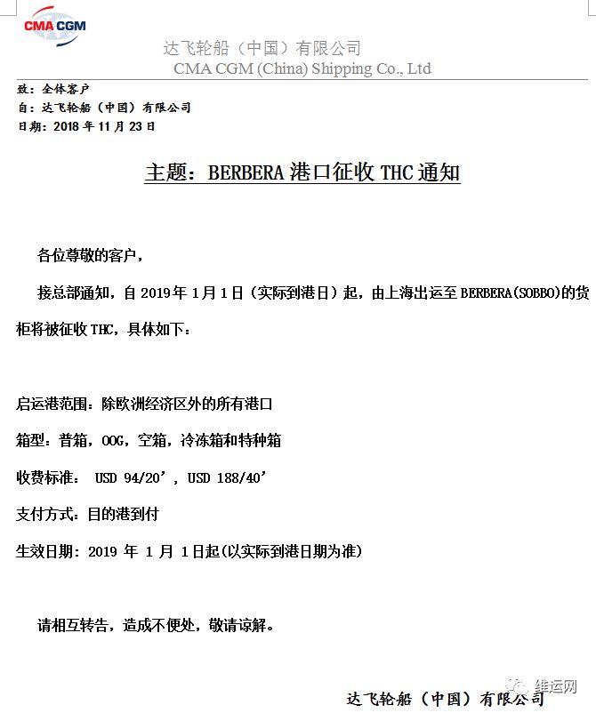 从12月1日起,达飞轮船将收取中国至肯尼亚和坦桑尼亚的费率恢复费(GRR),标准为200美元/20英尺集装箱,400美元/40英尺集装箱(All cargo Dry, Reefer, OOG and Breakbulk)。