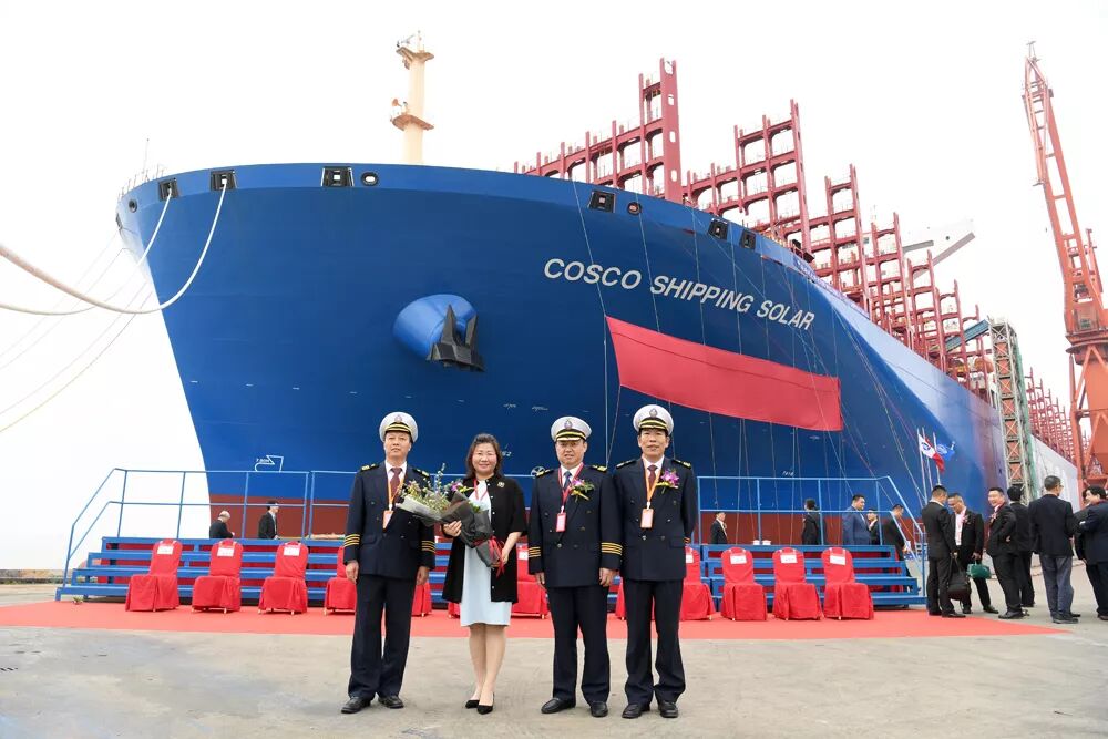 中远海运集运第四艘21000TEU超大型集装箱船中远海运太阳轮(COSCO SHIPPING SOLAR)命名仪式在江南造船(集团)有限责任公司码头举行。江南造船集团副总经理张俭,纪委副书记刘祥博、DNV-GL全球副总裁侯聚真、中国船级社上海分社副总经理徐立,中船贸易公司亚太部副总经理郑民胜、中远海运集运副总经理辜忠东、陶卫东,纪委书记袁健、中远海运太阳轮船长孙旭东、政委易开成、轮机长李潮安等参加了本次命名仪式。