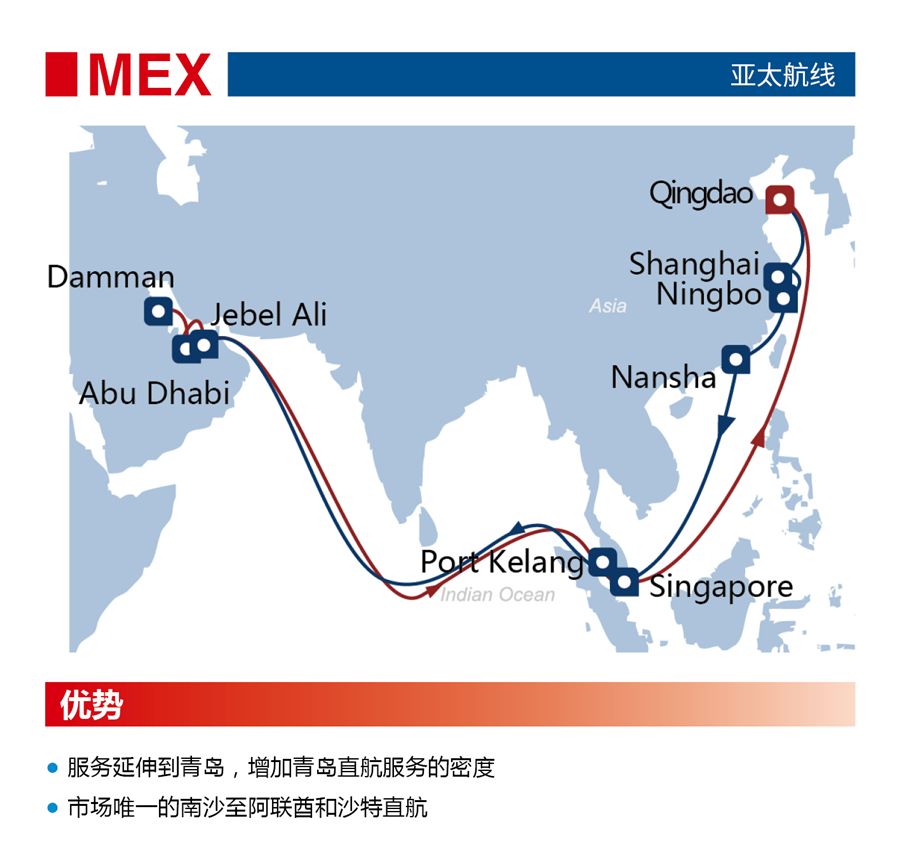MEX航线是中远海运集运的精品航线,多年以来以提供远东至中东快航服务,享有良好的市场口碑。
